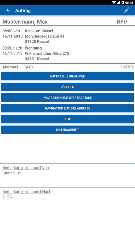 Sie können bequem zur Adresse der zubefördernden Person oder zur Zieladresse navigieren. Die APP ruft hierbei die in Ihrem Gerät als Standard hinterlegte Navigations-APP auf.